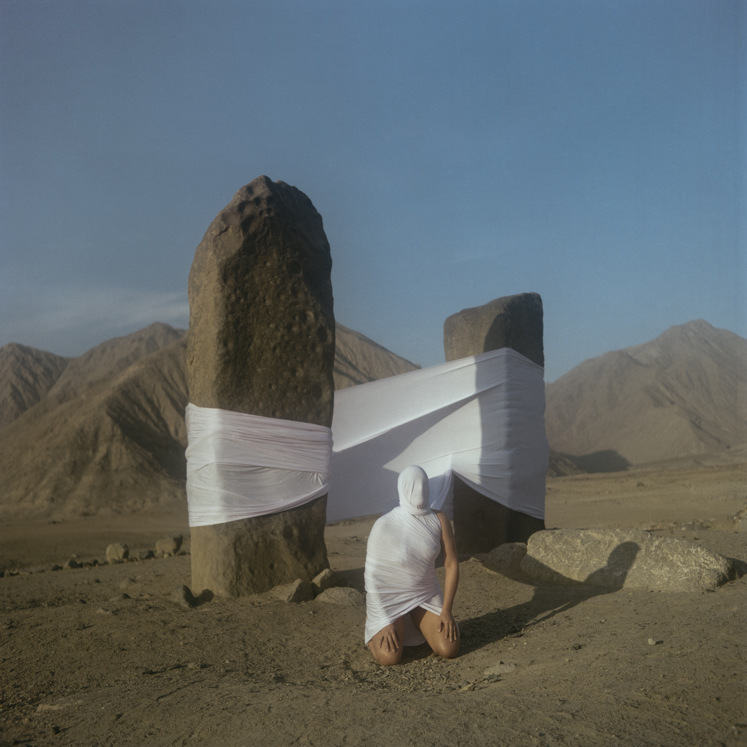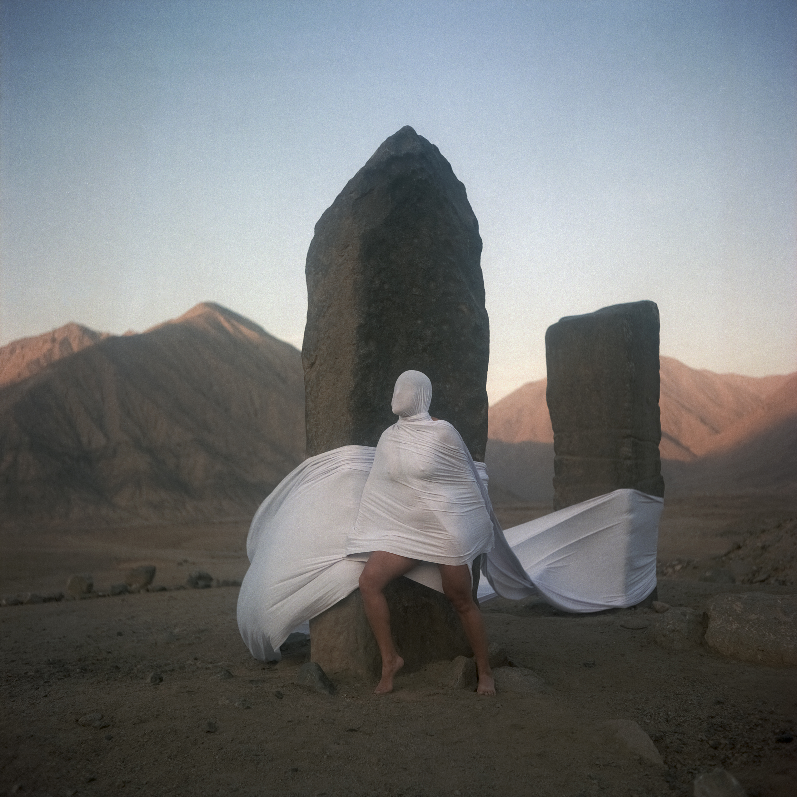 Serie de fotografías que instalan monumentos de acción performática en el espacio público. Los pedestales que los reciben abarcan desde piedras y bases de construcción hasta recintos abandonados o periferias arqueológicas. La tela blanca que los envuelve actúa como el yeso de las esculturas: en una primera etapa cubre solo el rostro –en referencia al cuadro Los amantes de Magritte–, para luego entrelazarse con el soporte físico y expandir la escala del monumento. El mundo de los espíritus, que arraiga en nuestra naturaleza ancestral, tiende un puente entre lo histórico y lo contemporáneo. Es en ese tránsito donde se manifiestan las tensiones simbólicas que recorren la vida y la muerte, bajo un nuevo relato textil. En el territorio de la historia, el patrimonio no deja de surgir. De invocar.